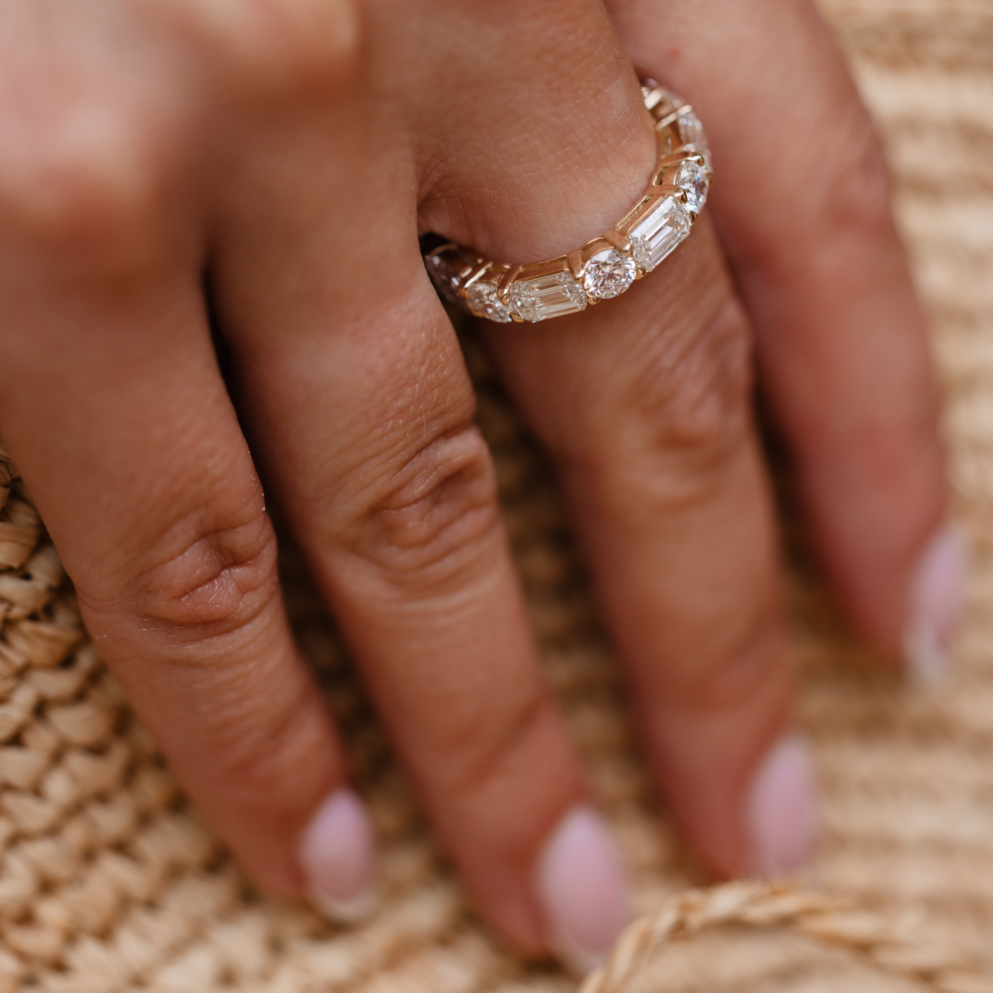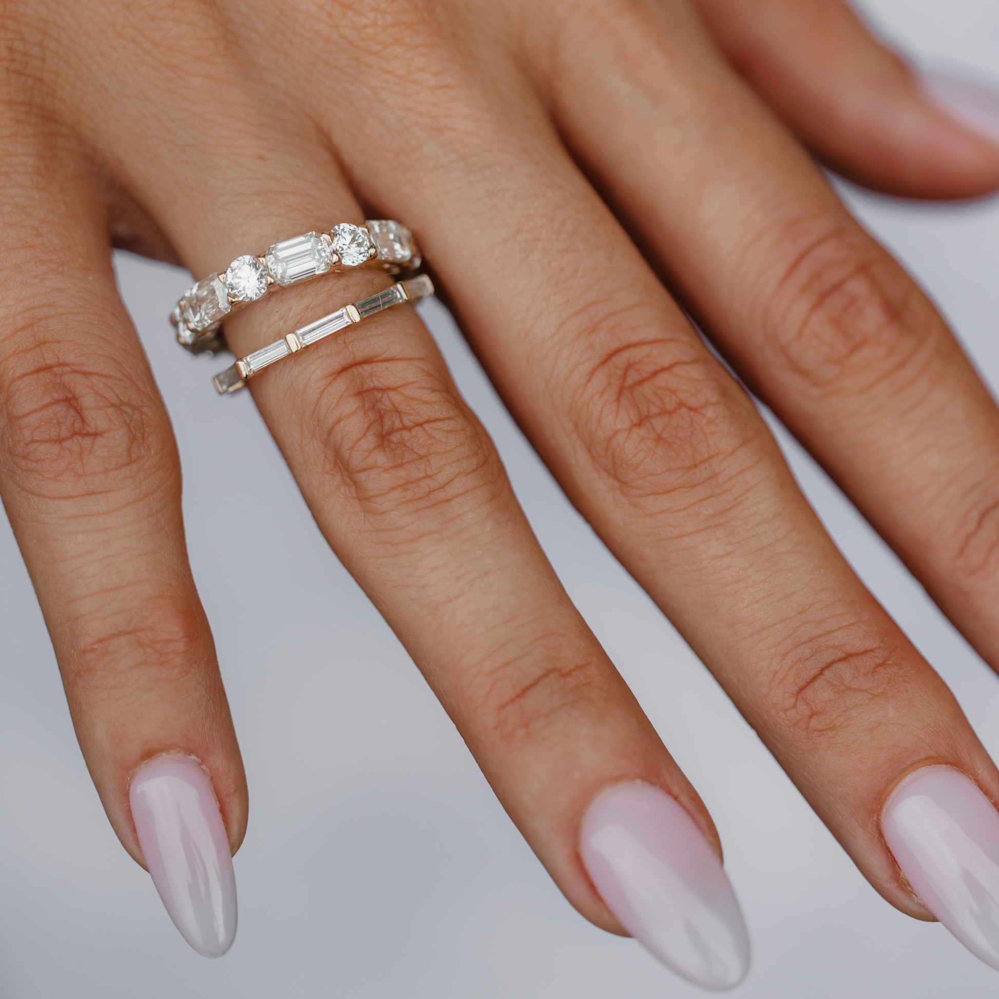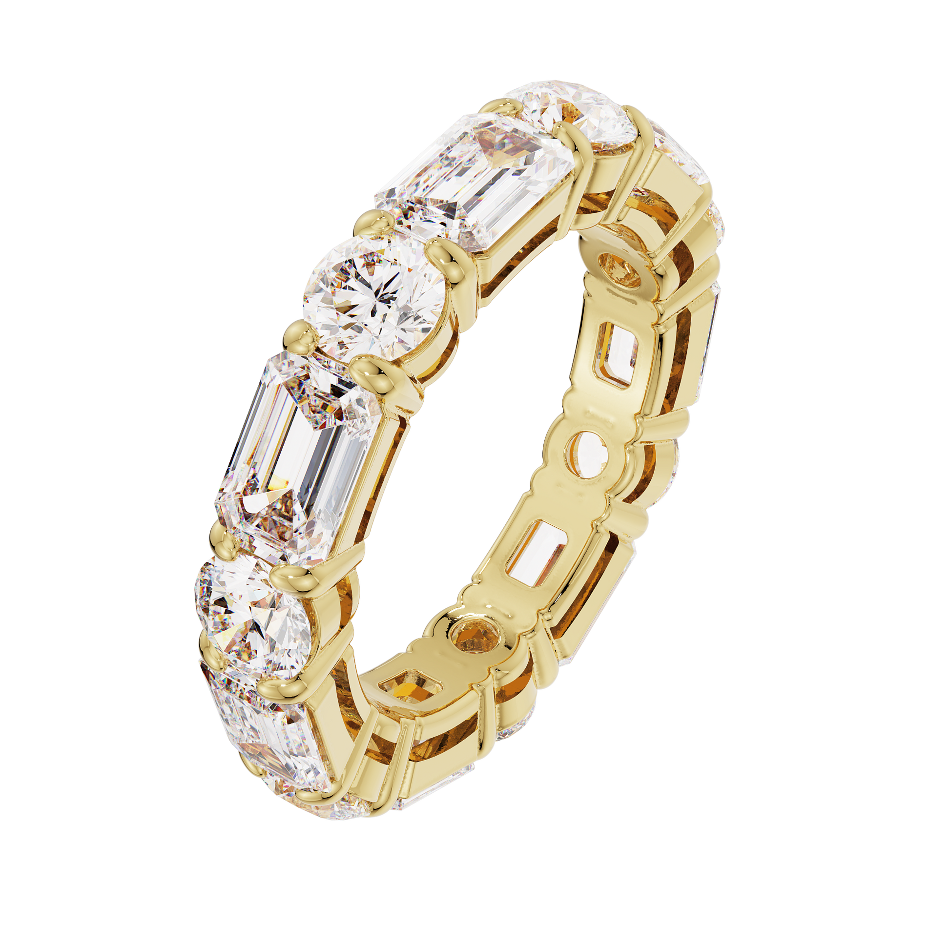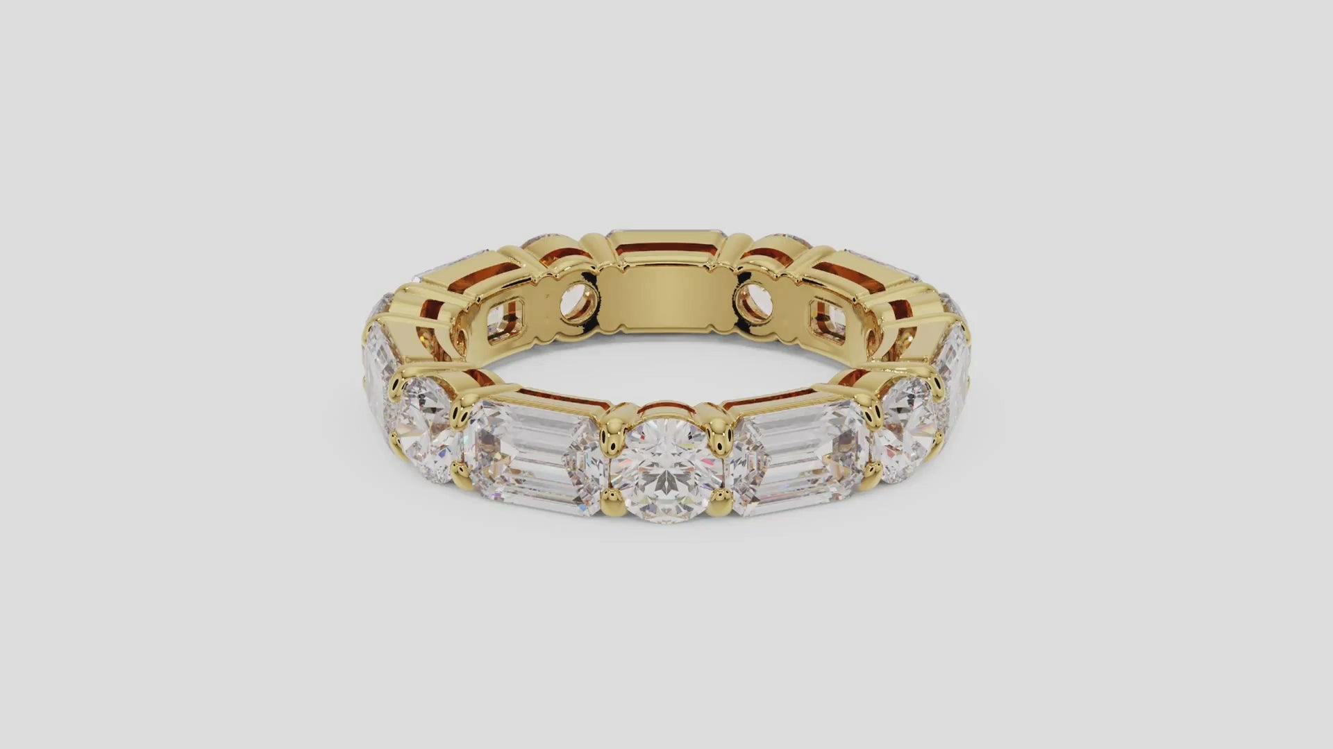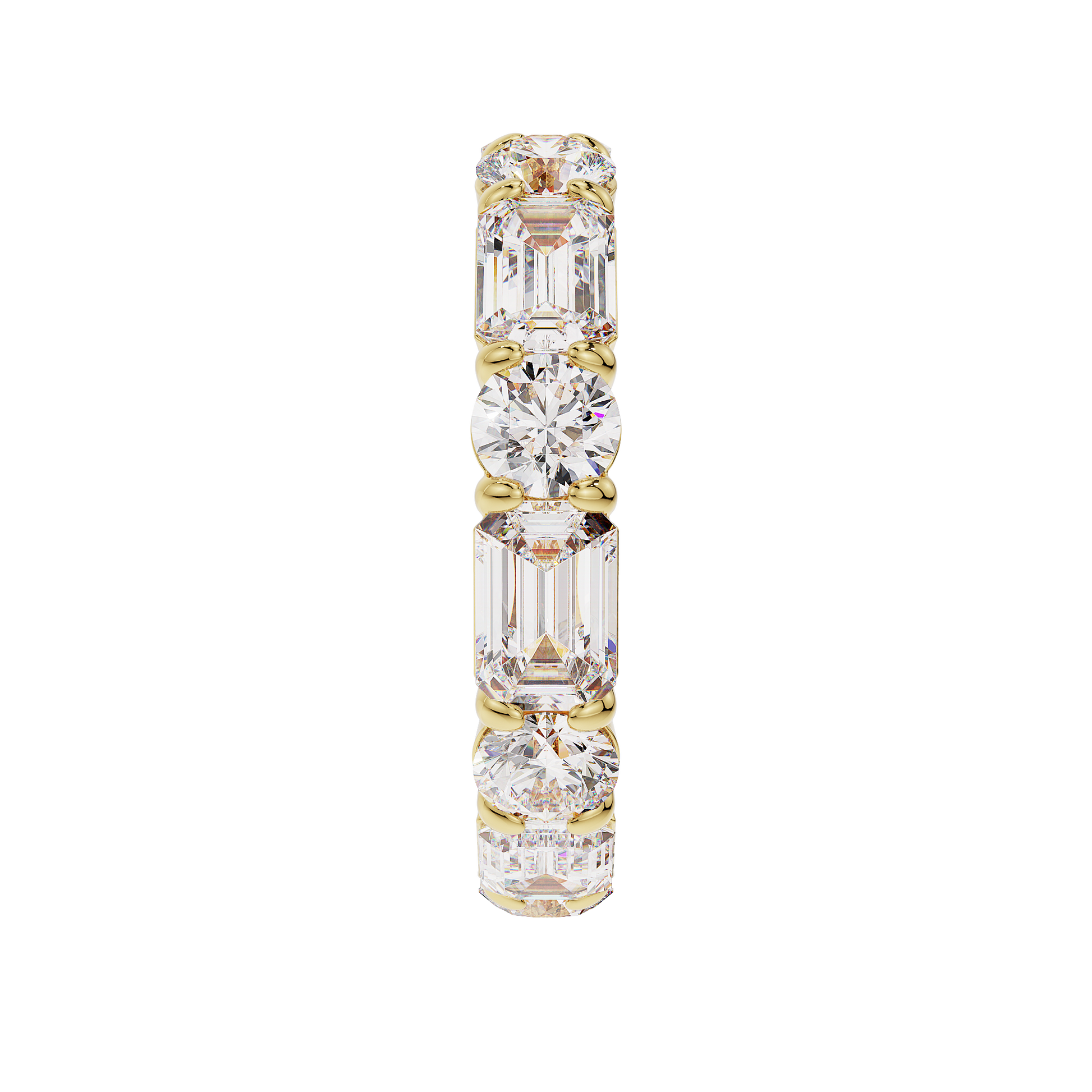 This alternating diamond band uses approximately 4mm (.25ct each) rounds and 4mm x 5.5mm (.50ct) each emerald cuts.
