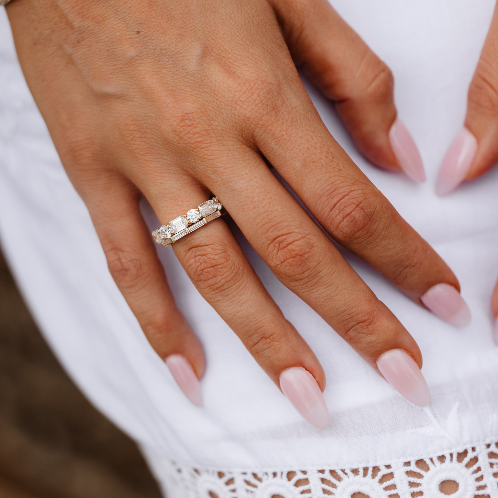 Unless specified otherwise, we use VS clarity for step cuts (emerald, baguette, asscher) and SI1-VS2 clarity for brilliant cuts (all other shapes). G-H color is used, or we can match the color to your engagement ring. When sourcing other clarities and colors, pricing may need to be adjusted.