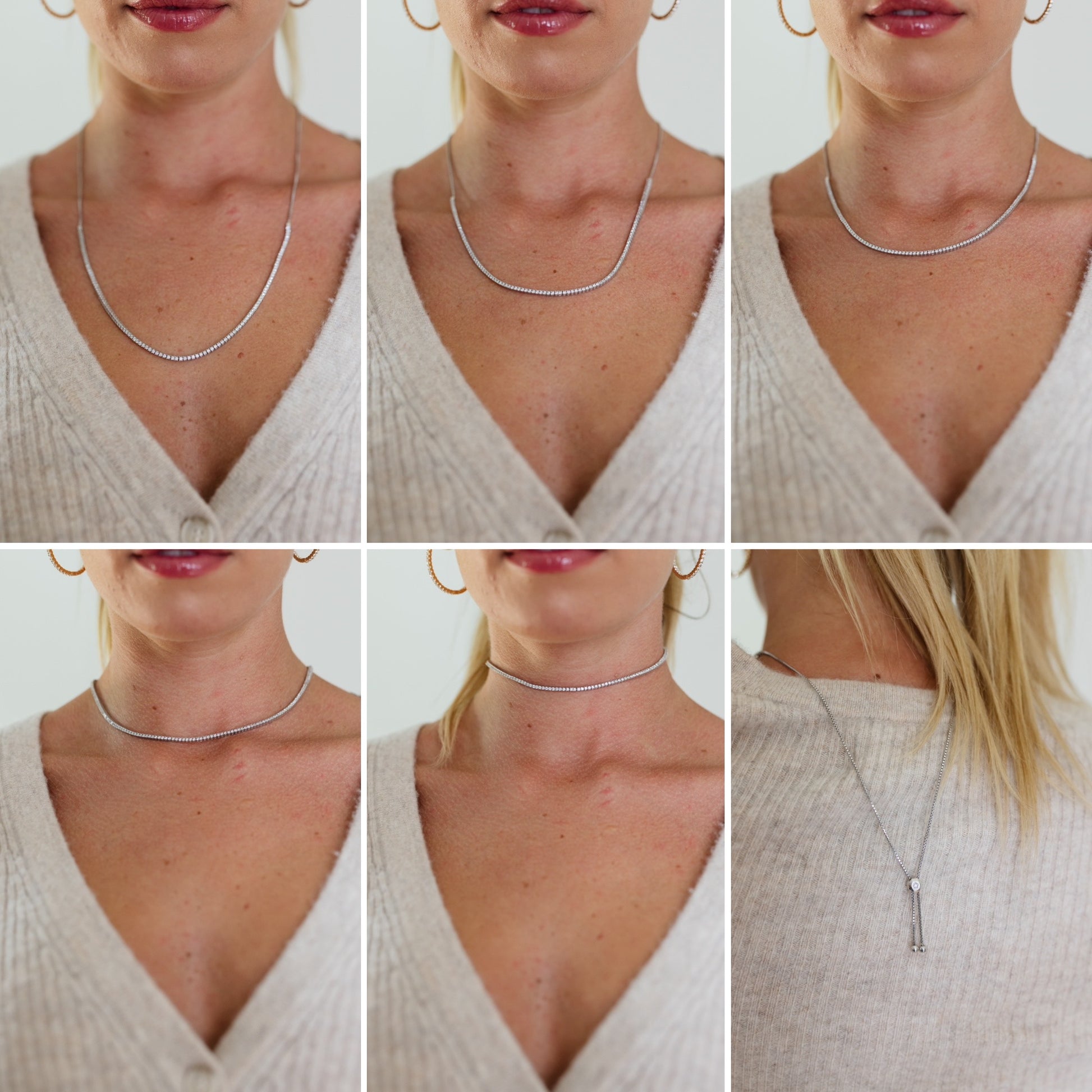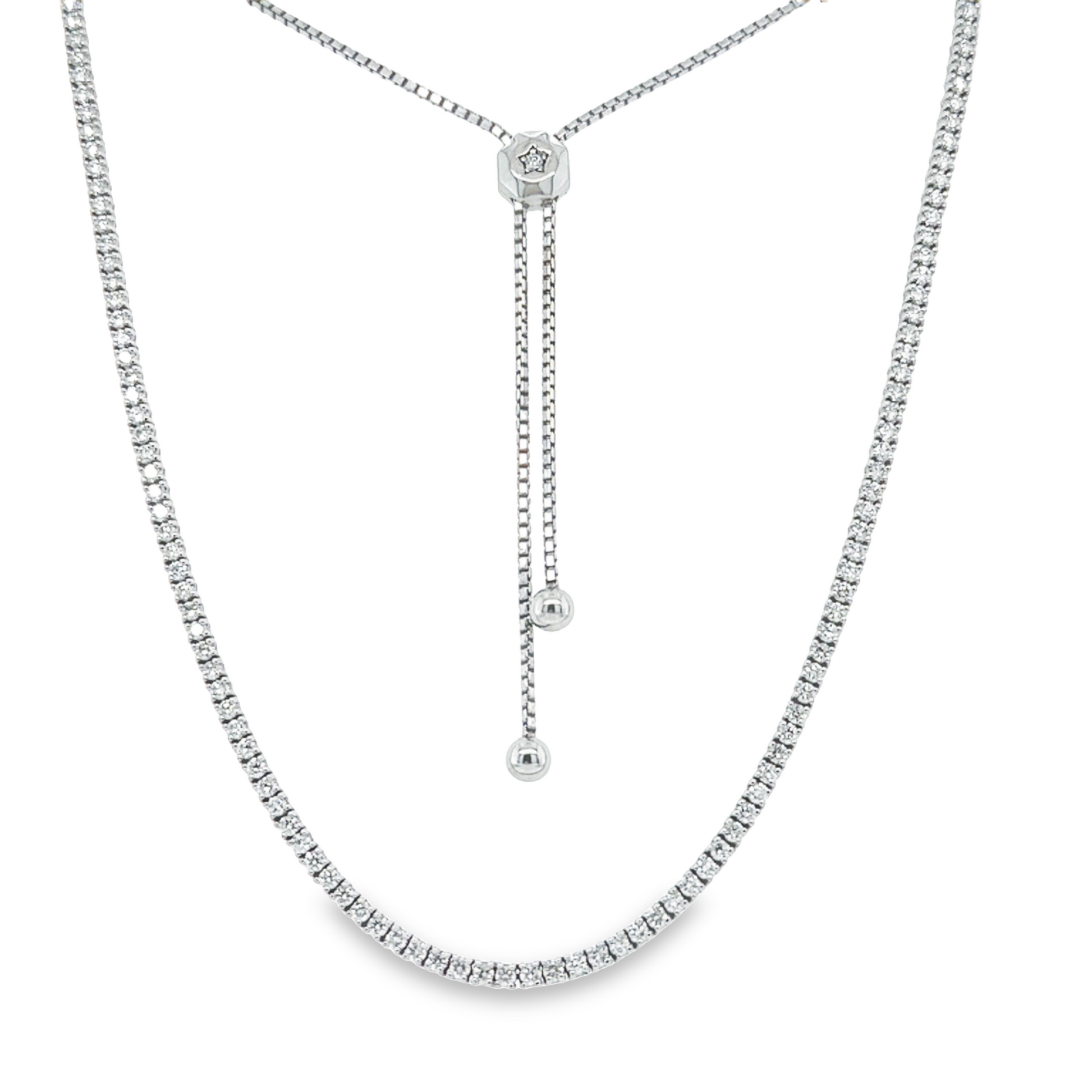 This adjustable diamond necklace can be worn as tight as a choker and as long as 22 inches. When worn higher up it gives the look of a tennis necklace.