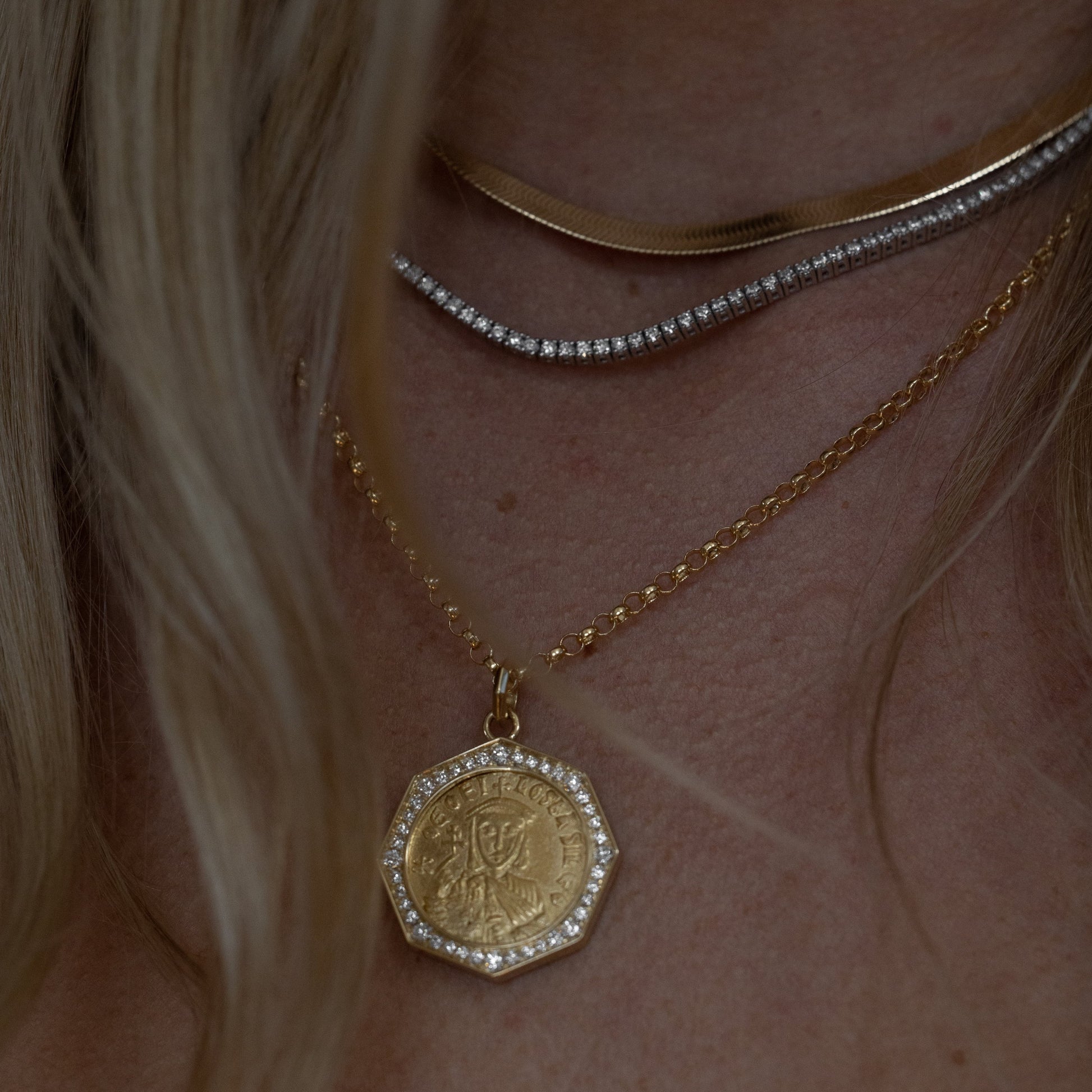 A real gold coin necklace is a very classic piece to add to your fine jewelry collection. This 24K Theophilis Byzantine Empire coin from 829-844 C.E. is one of a kind. We've set the coin in our signature 18K yellow gold Caurbon graduated diamond octagon bezel.