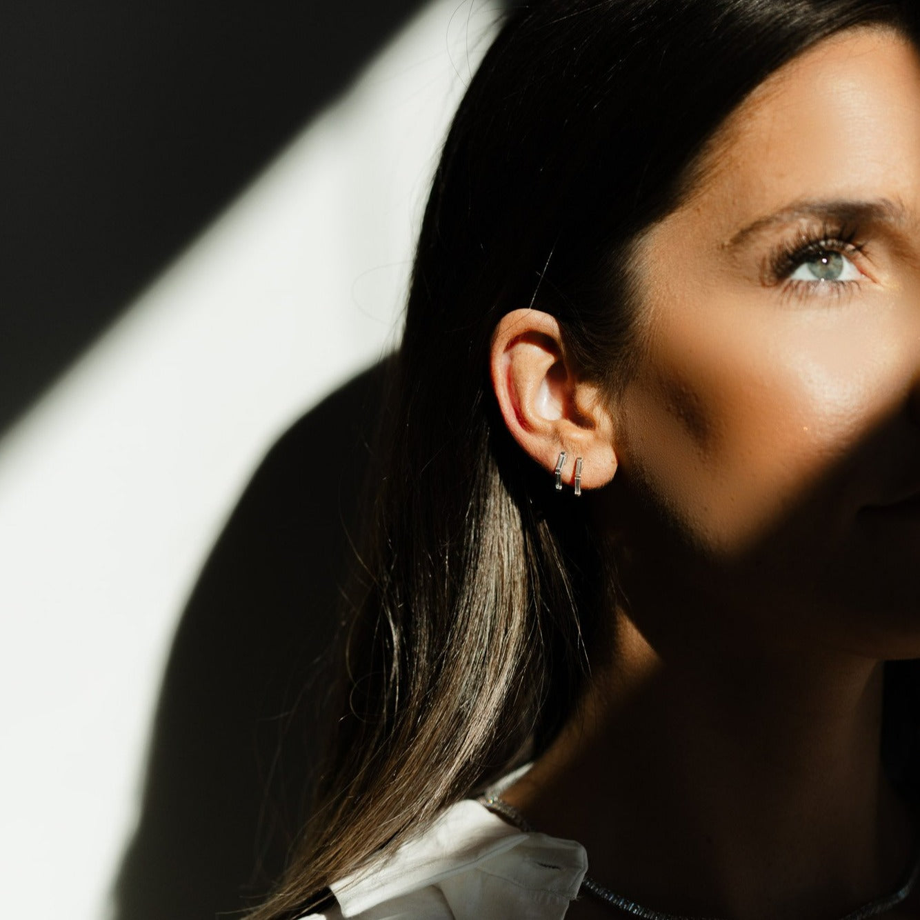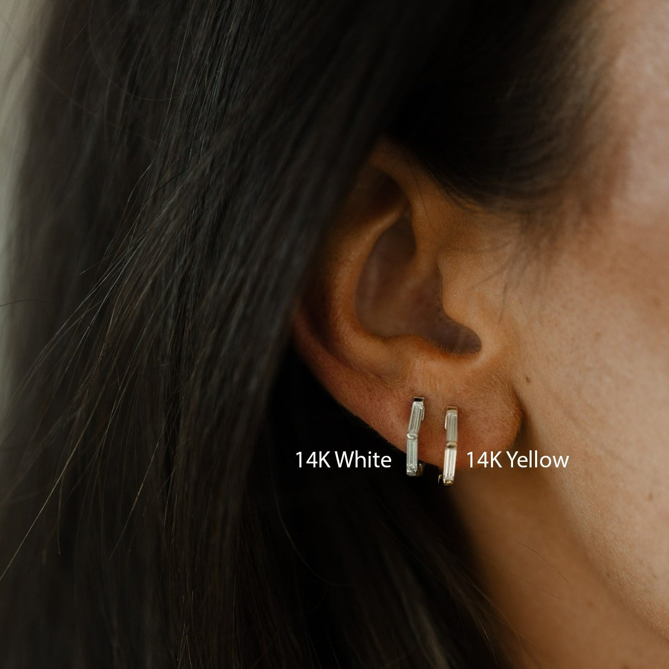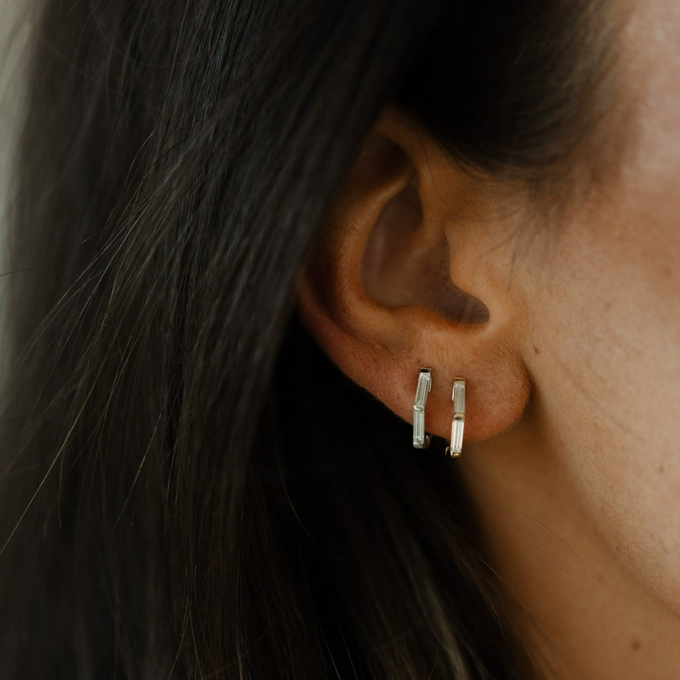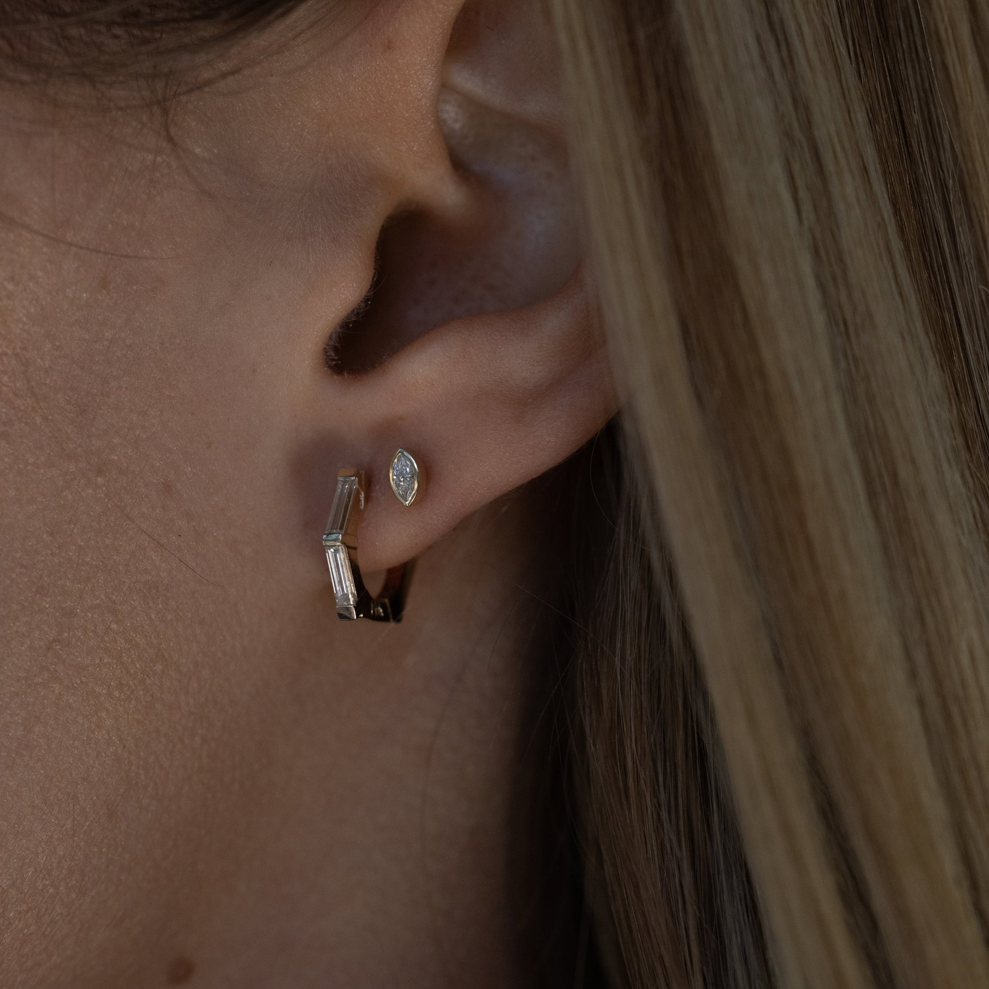 These huggies were custom made originally by Sydney, as she fell in love with the super unique elongated baguettes. These are called the Caurbon huggie, as its geometric hexagon shape is a motif we use throughout our collection and branding to represent the facets of diamonds.