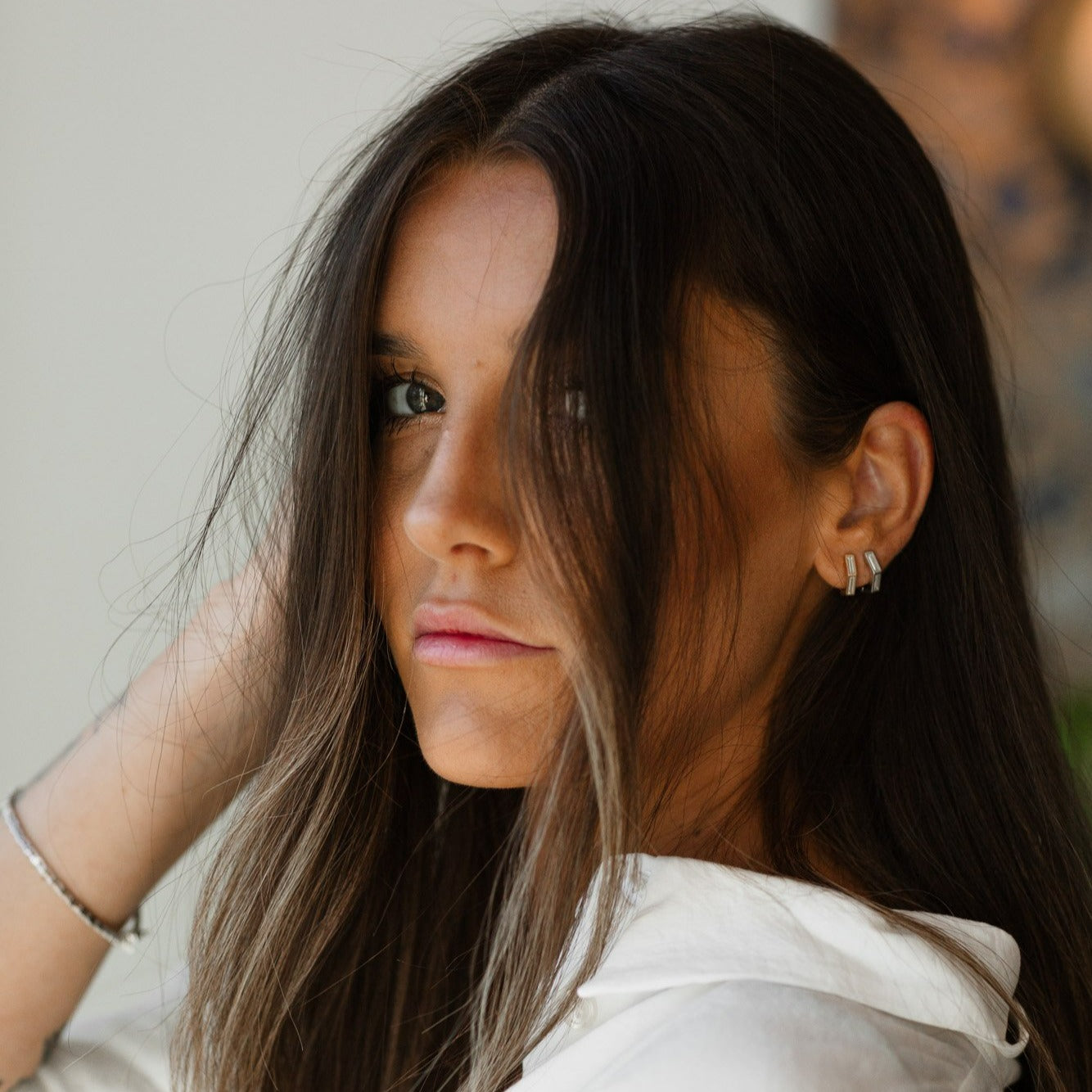 These huggies were custom made originally by Sydney, as she fell in love with the super unique elongated baguettes. These are called the Caurbon huggie, as its geometric hexagon shape is a motif we use throughout our collection and branding to represent the facets of diamonds.