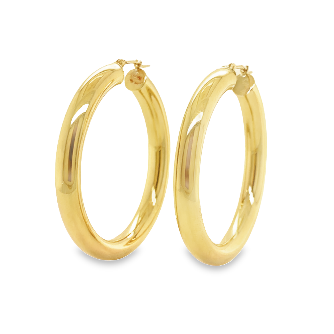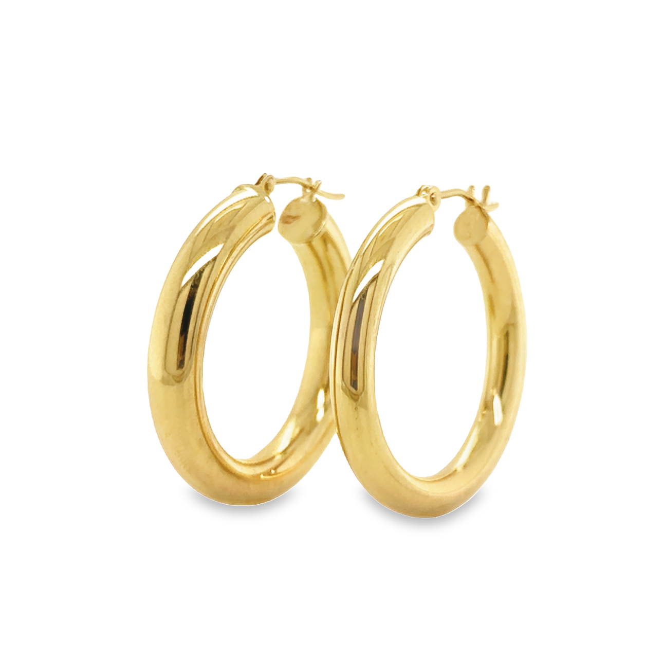 Hoop earrings are a jewelry box staple. These are made from pure 14K gold, but they are hollow on the inside so that they don't weigh down your ear.