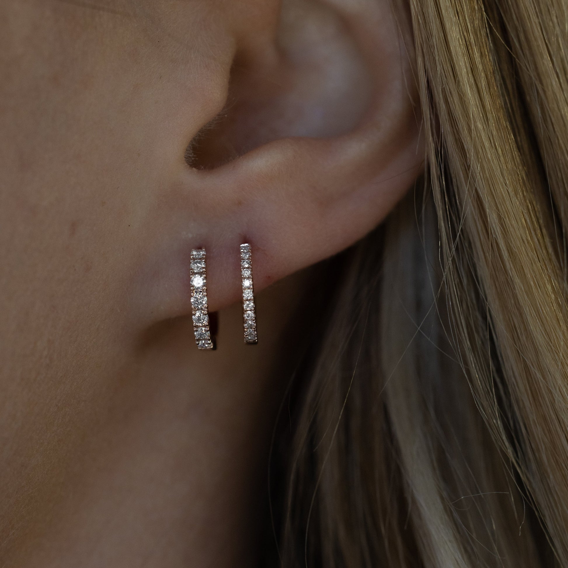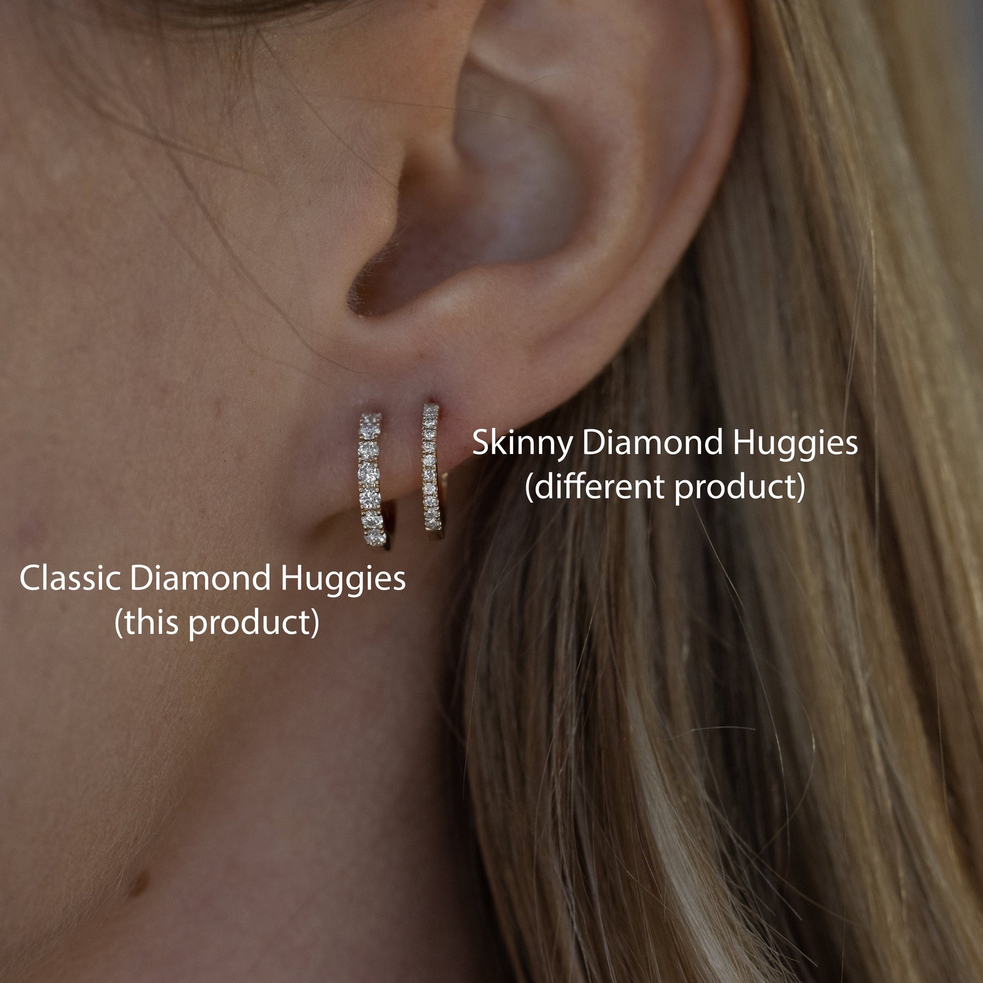 Diamond huggies are the best everyday earring! With slightly larger diamonds, these classic diamond huggies are one step up from our skinny diamond huggies.