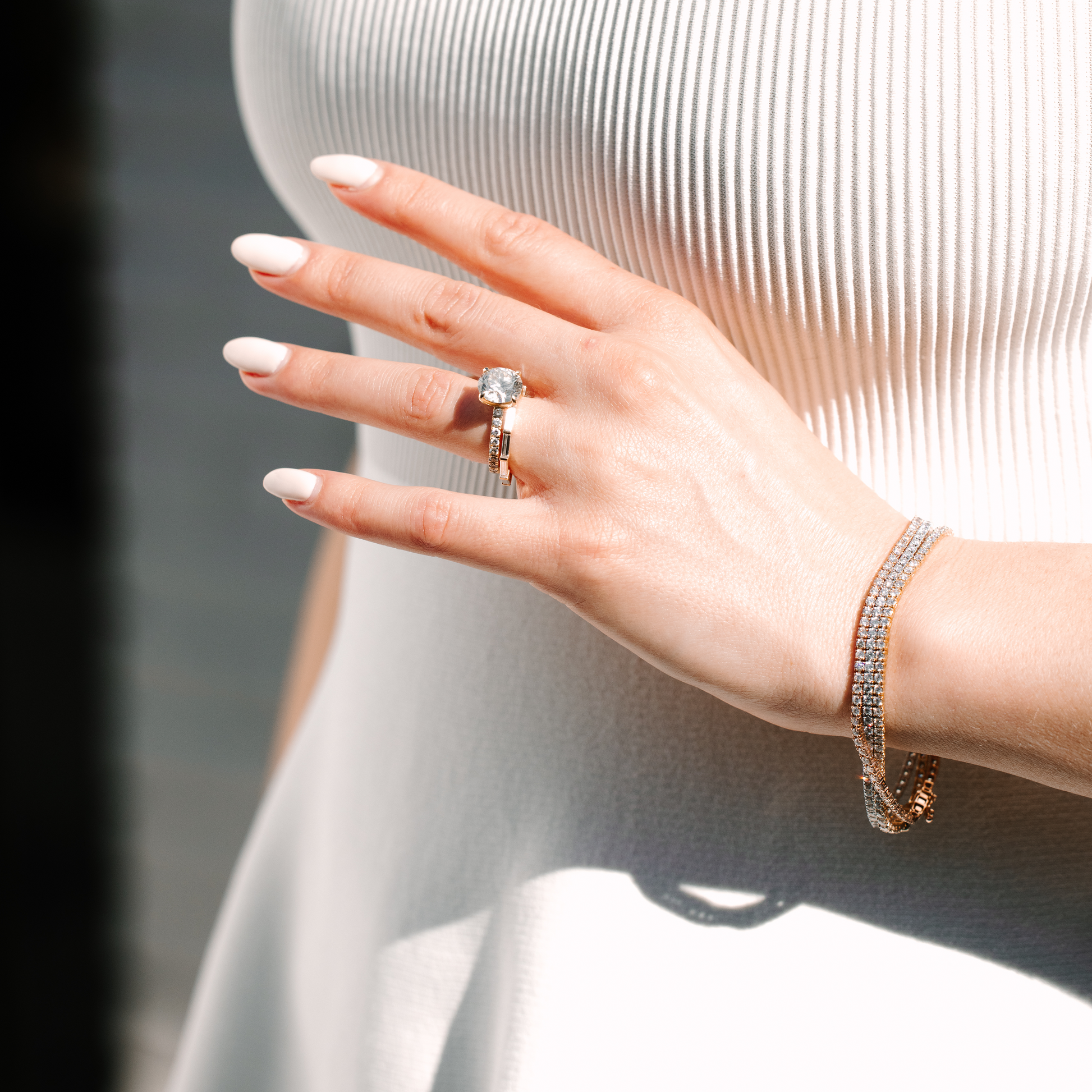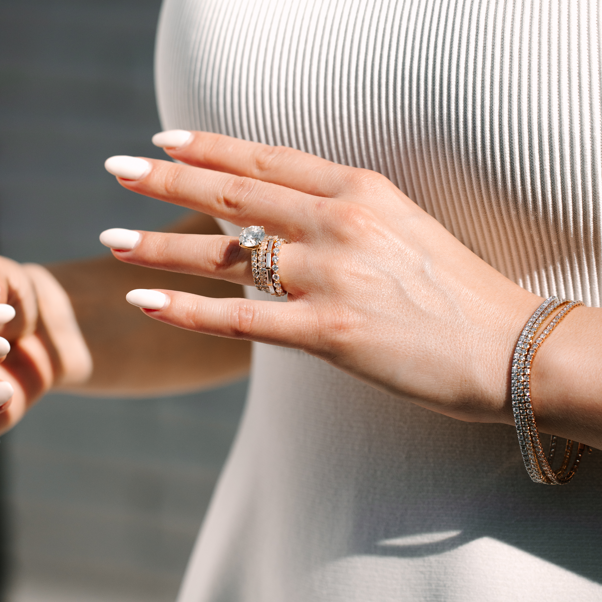 Unless specified otherwise, we use VS clarity for step cuts (emerald, baguette, asscher) and SI1-VS2 clarity for brilliant cuts (all other shapes). G-H color is used, or we can match the color to your engagement ring. When sourcing other clarities and colors, pricing may need to be adjusted.