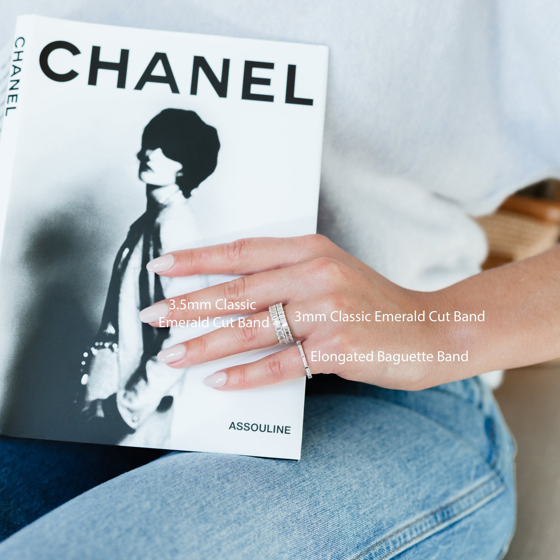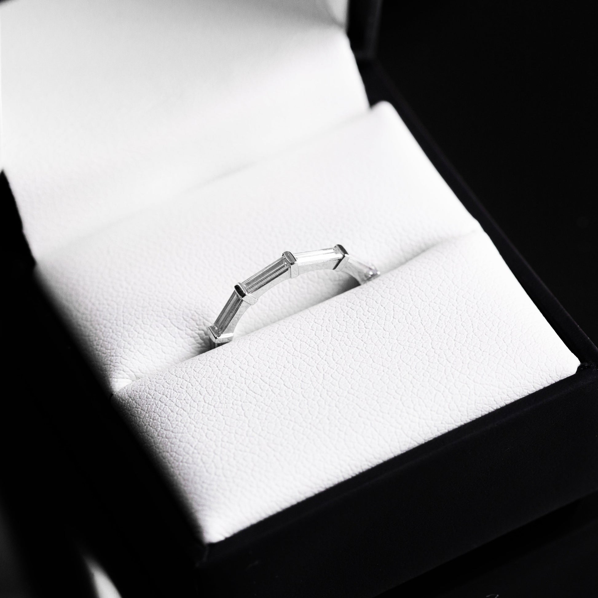 Caurbon's signature elongated baguette band maximizes diamond coverage and is super thin and stackable. It uses 1.5mm x 5.5mm (.09 carat each) diamonds. See additional details below.