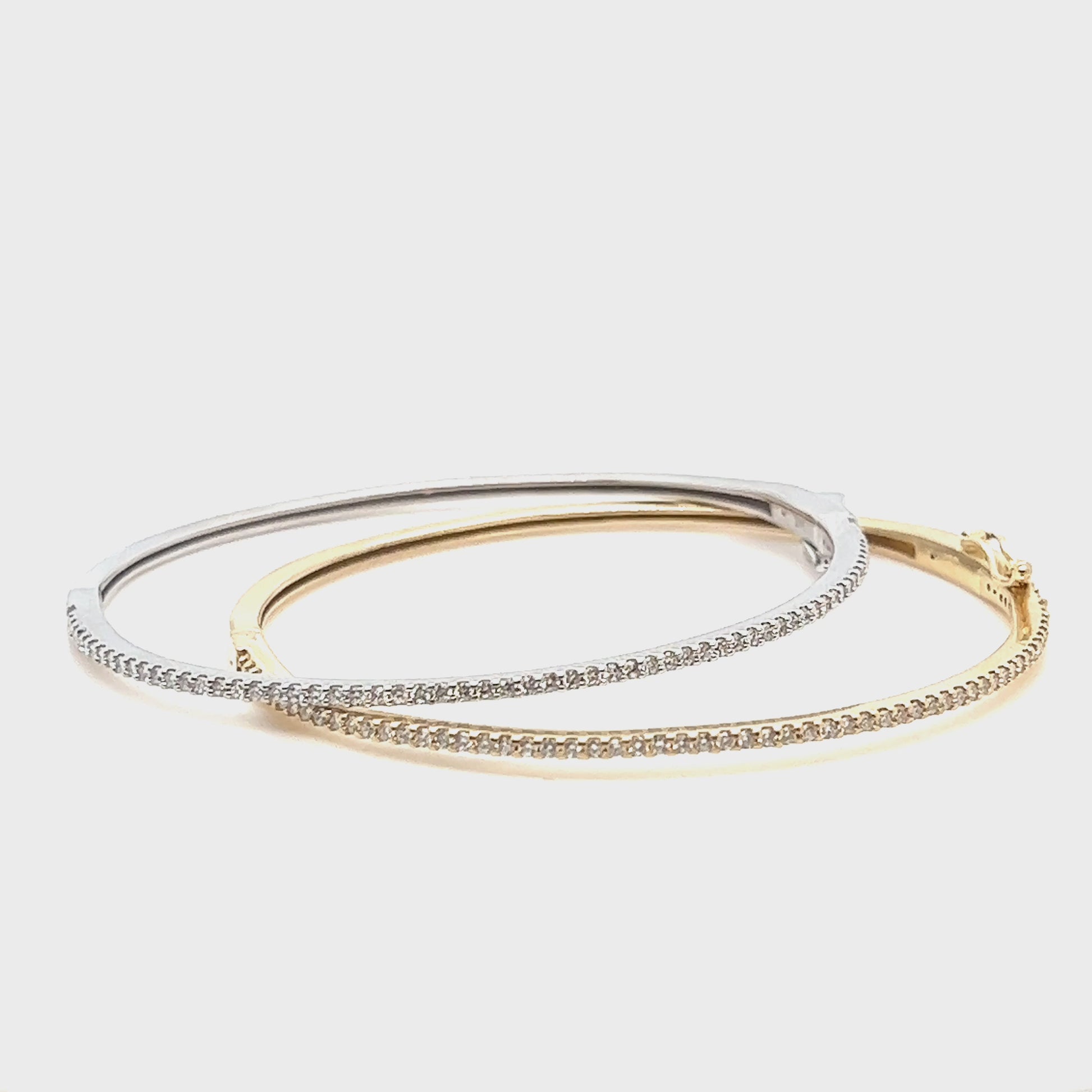 Bangles are a very classic bracelet loved by many. This dainty halfway diamond style can be worn alone or added to an existing bangle stack.